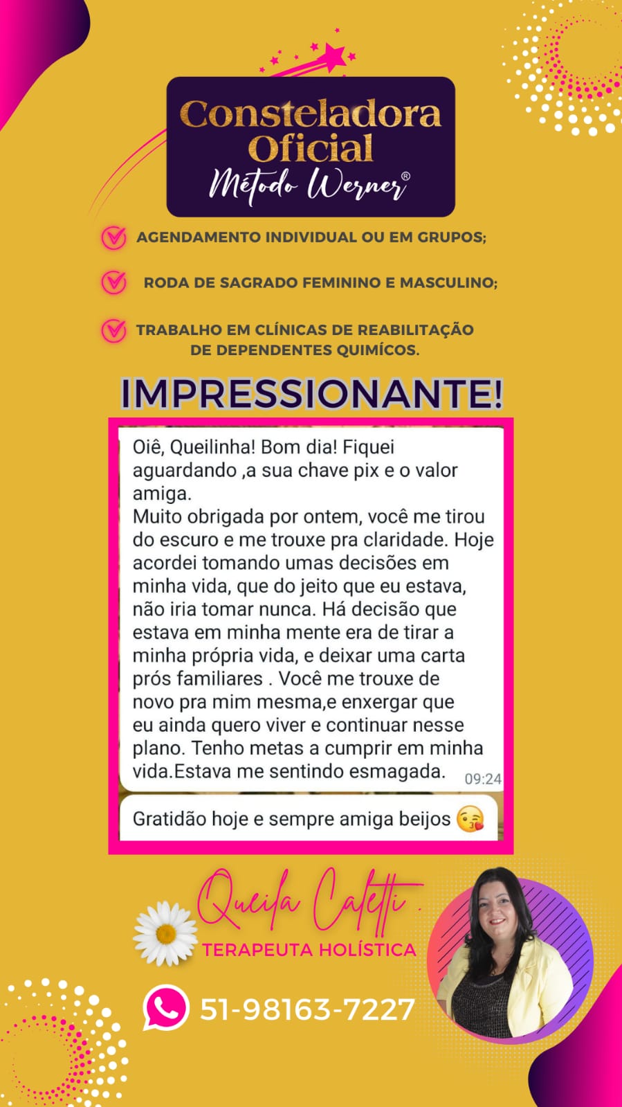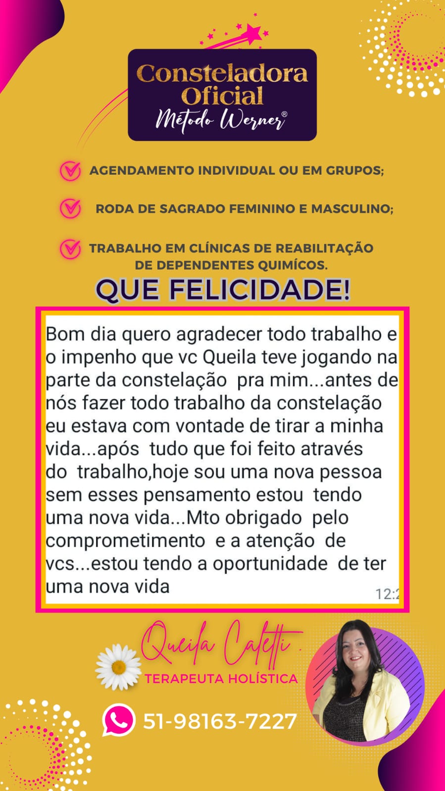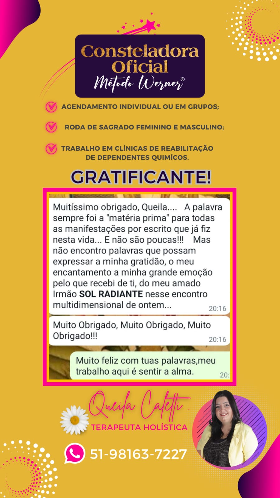 As Constelações e Ativações deste Protocolo são específicas para serem trabalhadas com foco na liberação dos pontos que causam as feridas do feminino ferido, relacionados à origem familiar, nesta existência ou em vidas passadas. Neste sentido, trabalhamos com a Terapia Multidimensional Werner® com à visão de Fernanda Werner que une conhecimentos únicos.